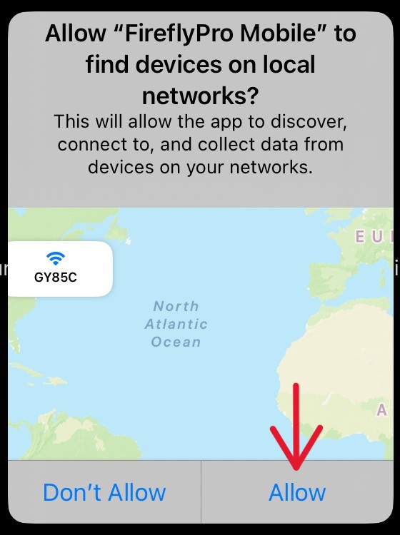 - Go back to the App Store and reinstall FireflyPro Mobile. During installation, when you are asked to “Allow “FireflyPro Mobile” to find device on local networks?” you must select ALLOW or the camera will not connect. (Image copied below)
